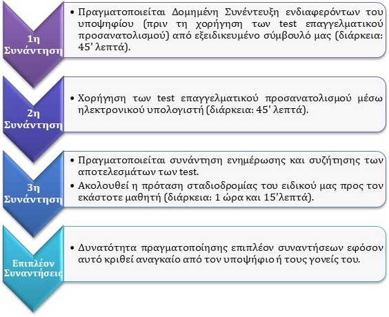 Το CareerCounseling διεξάγεται σε 3 στάδια και περιλαμβάνει 3 (σε ένα πρώτο βασικό επίπεδο) συναντήσεις ως εξής: